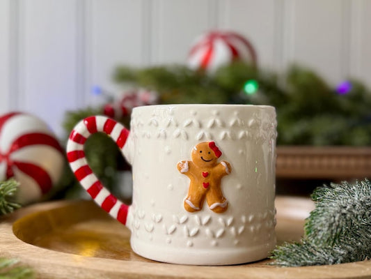 Christmas Gingerbread Man Stoneware Festive Mug With Candy Cane Handle | Includes Gift Box | Christmas Holiday Tableware