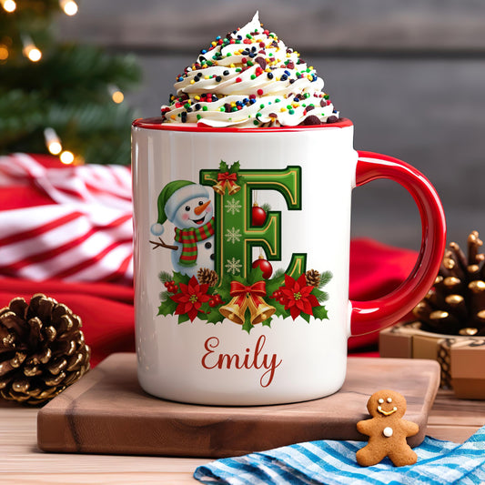 Monogram Christmas Snowman Mug Custom Name Initial Coffee Cup, Personalized Festive Holiday Mug Winter Gift for Xmas Letter Mug for Coworker